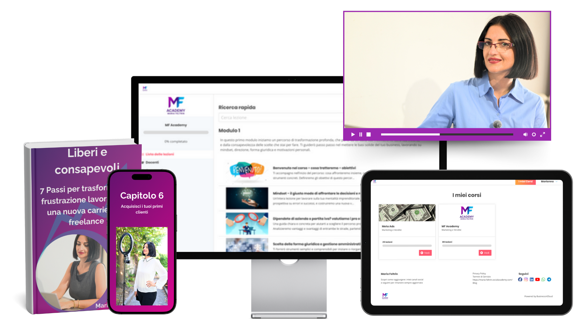 MF Academy è il percorso più completo, con video, strumenti e affiancamento per 6/12 mesi. I corsi on demand ti permettono di approfondire singoli argomenti in autonomia. La consulenza è una sessione strategica 1:1 per individuare insieme la direzione più adatta a te.